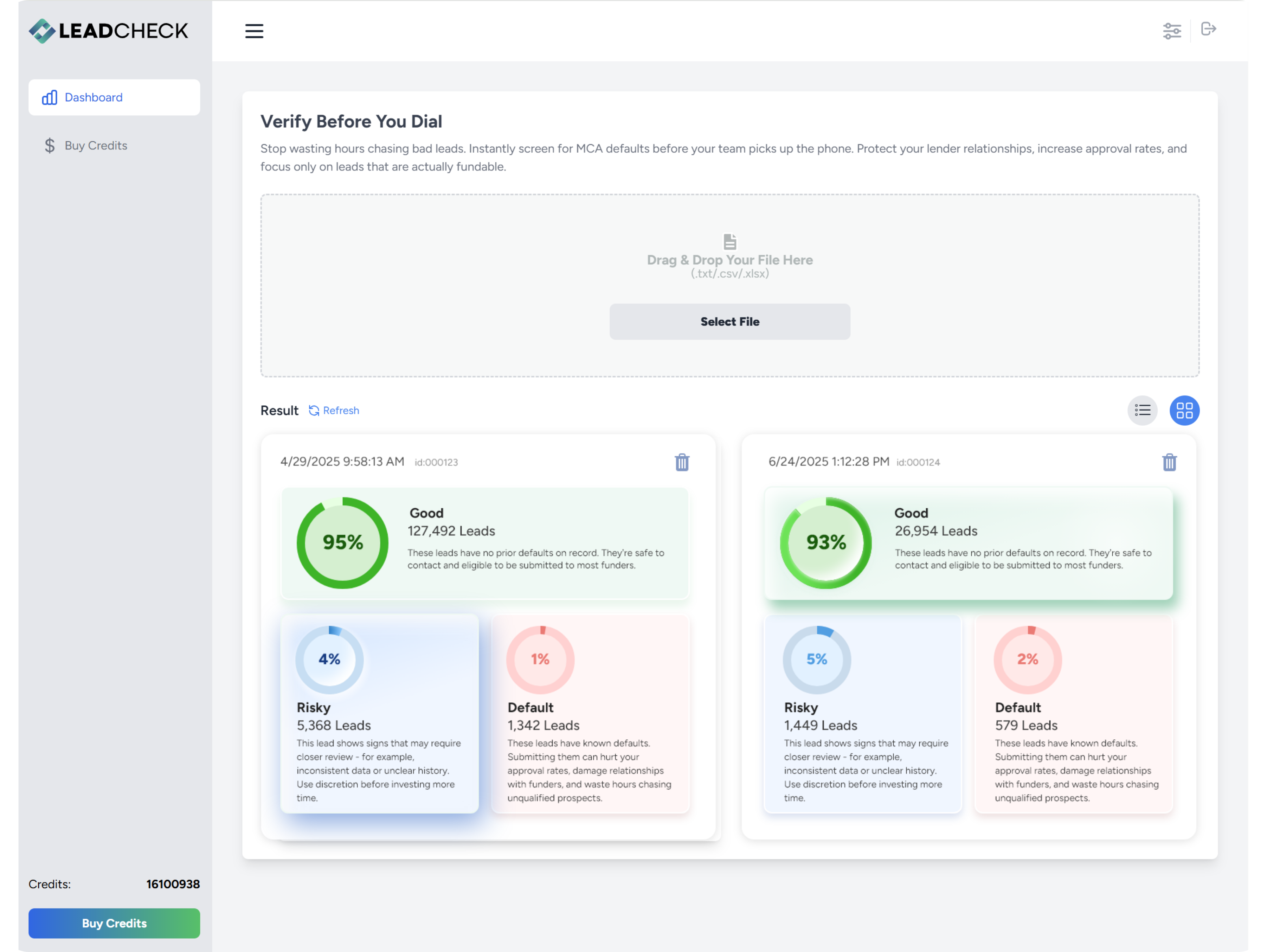 Top MCA brokers use LeadCheck to quickly check for past defaults, ensuring every call is worth their time, reducing wasted effort, and increasing their chances of closing real deals with fundable merchants.